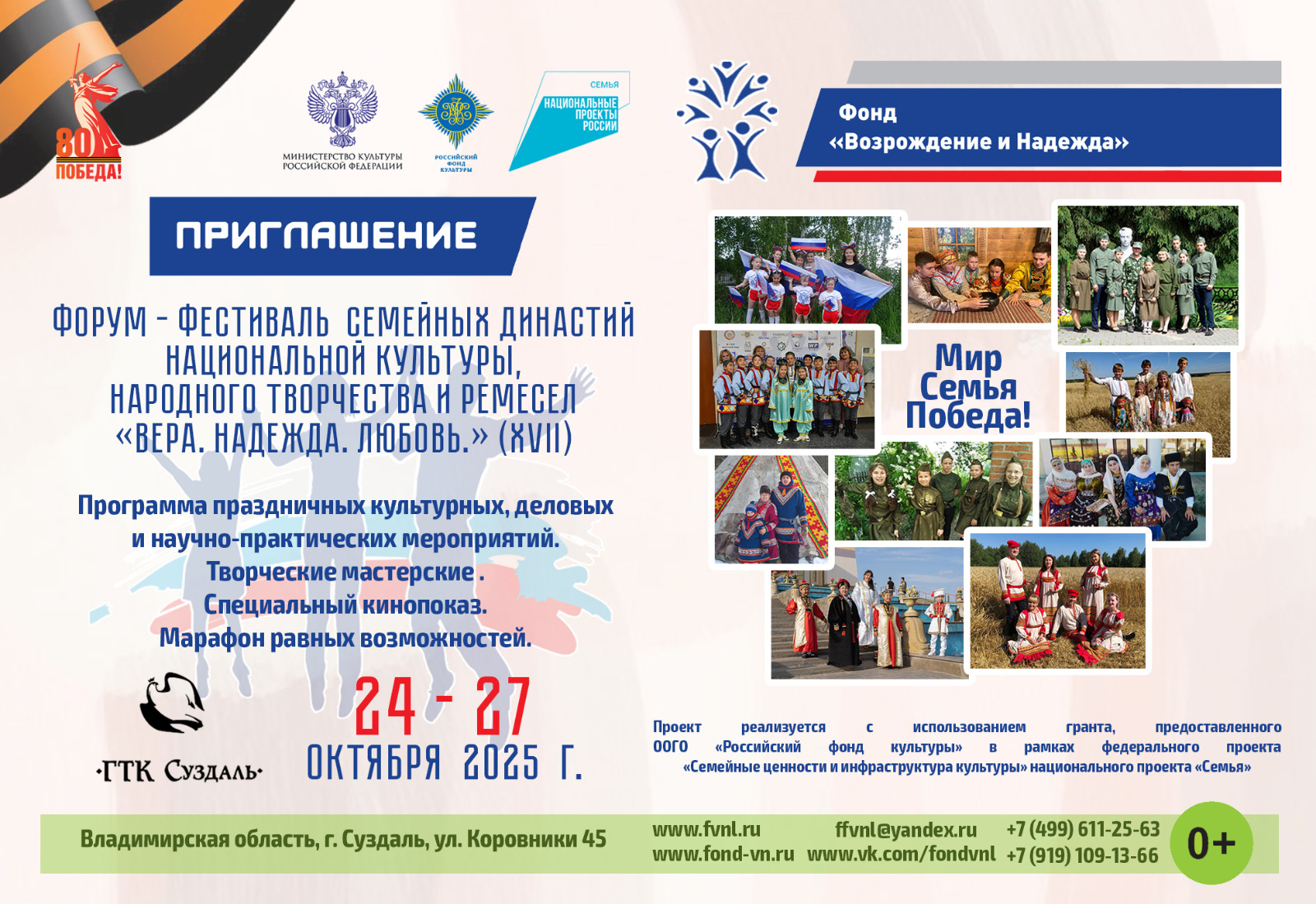 Дорогие люди! Приглашаем на форум фестиваль семейных династий, национальной культуры, народного творчества и ремесел «Вера. Надежда. Любовь.» город Суздаль. 24-27 октября